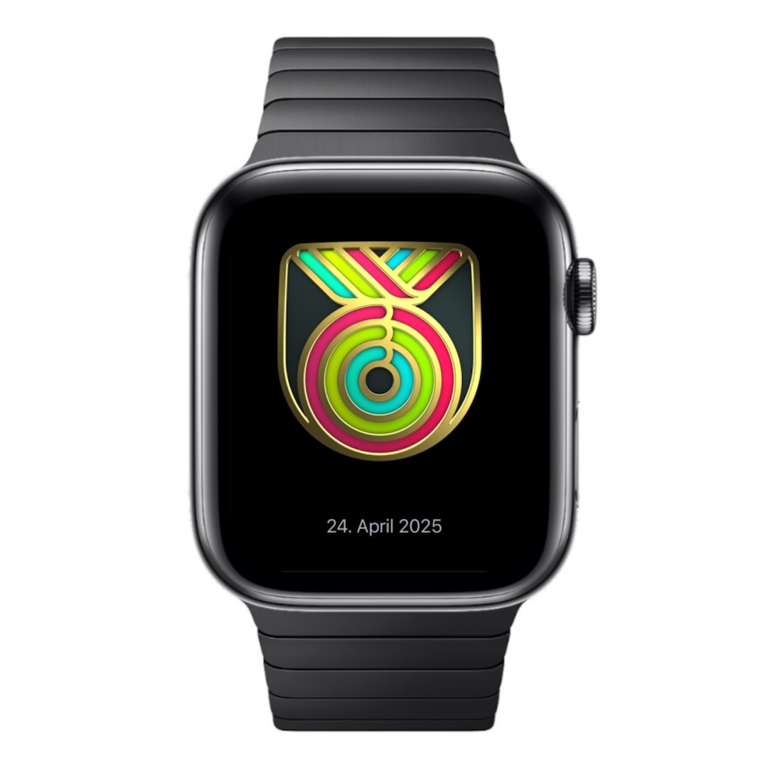 Du hast diese Auszeichnung erhalten, indem du am 24. April 2025 alle deine Aktivitätsringe geschlossen hast. Bei dieser Herausforderung drehte sich alles darum, das zu tun, was du magst, dich selbst voranzubringen oder etwas Neues auszuprobieren. Teile deine Aktivitäten mit #SchließeDeineRinge auf Social Media.